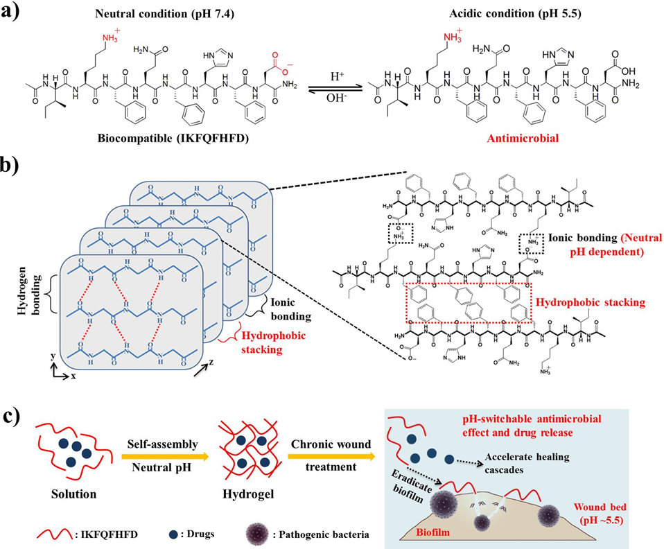 本工作在前期研究的基礎上,設計了一種具有酸性pH激活的廣譜抗菌八肽(IKFQFHFD)。此多肽在中性pH條件下具有良好的生物相容性,并能通過自組裝形成超分子水凝膠載藥體系。體外實驗表明,此水凝膠載藥體系在傷口感染微環境條件下(酸性pH)能夠發生解聚,從而同時實現了生物膜的殺傷和傷口愈合藥物的原位釋放。另外,動物實驗結果表明,此水凝膠體系能夠在20天內成功實現糖尿病小鼠耐藥細菌生物膜感染傷口的完全愈合,顯示出了作為慢性傷口敷料的巨大應用潛力。