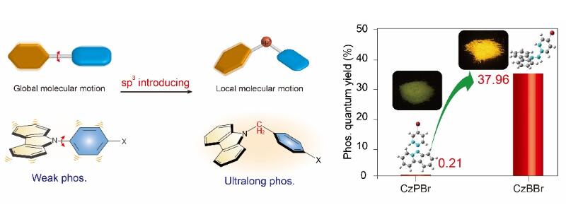 近日,我校材料科學(xué)與工程學(xué)院朱衛(wèi)國(guó)教授團(tuán)隊(duì)和南京工業(yè)大學(xué)安眾福教授團(tuán)隊(duì)合作,巧妙利用sp3雜化的亞甲基聯(lián)姻給體(D)和受體(A)單元,發(fā)展了一類(lèi)新型D-C(sp3)-A型高效率超長(zhǎng)有機(jī)RTP材料。這類(lèi)貌似“四面體”的分子具有與眾不同的結(jié)構(gòu)特點(diǎn),其非共軛的亞甲基可有效“打斷”D-A單元之間的電子離域,阻礙激發(fā)態(tài)躍遷中的結(jié)構(gòu)變形,從而抑制分子的非輻射躍遷,實(shí)現(xiàn)高效率超長(zhǎng)有機(jī)室溫磷光。單晶分析和理論計(jì)算發(fā)現(xiàn),晶體中分子間的π-Br相互作用可加速系間穿越(ISC)的過(guò)程,亞甲基的嵌入可使單線(xiàn)態(tài)激發(fā)態(tài)(S1)從整個(gè)分子的離域轉(zhuǎn)變?yōu)榫植窟沁虻碾x域,這意味著CzBBr激發(fā)態(tài)衰減過(guò)程中的結(jié)構(gòu)變形遠(yuǎn)小于CzPBr的結(jié)構(gòu)變形。最終CzBBr的磷光量子效率(ФPh)高達(dá)38%。這項(xiàng)研究開(kāi)拓了高效率、長(zhǎng)壽命RTP材料構(gòu)建的新路徑。