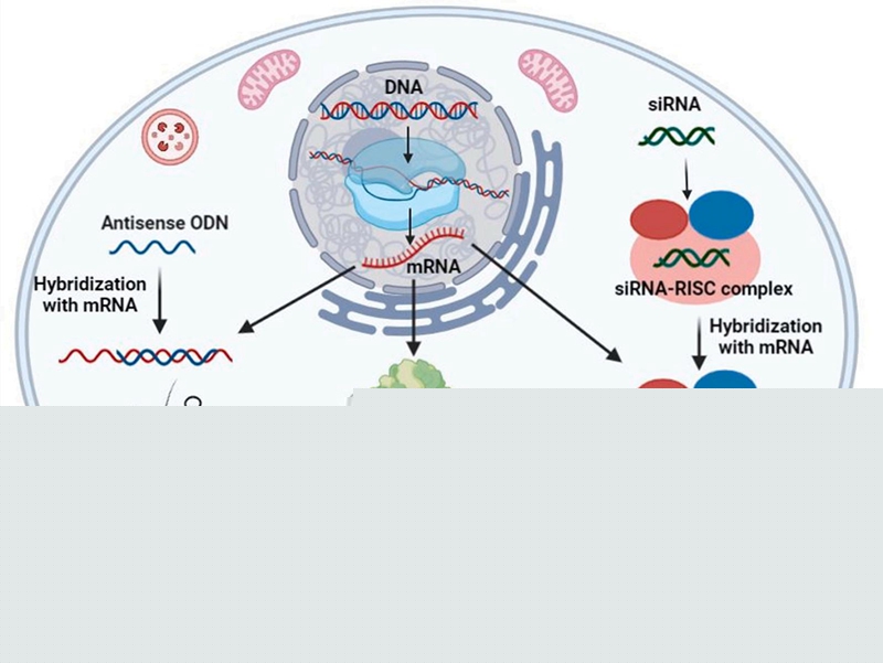 圖2. mRNA, siRNA, 反義寡核苷酸的細胞內通路示意圖。