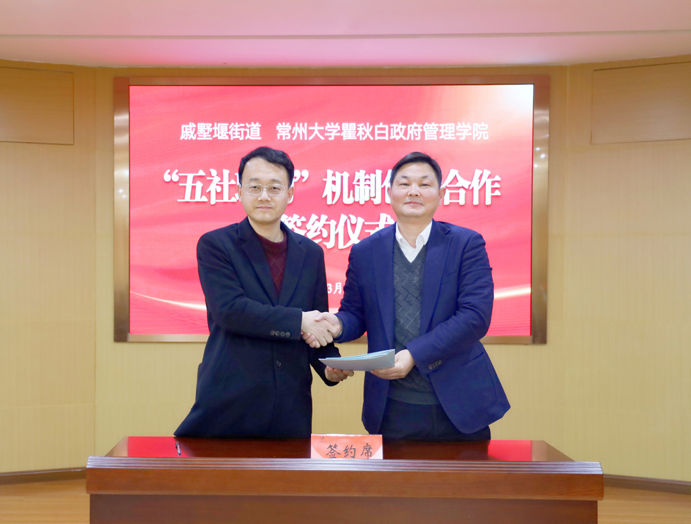 劉曉蓮介紹了街道近期社區建設和社會治理工作情況。陳粲介紹了學校和學院的基本情況,希望與戚墅堰街道加強合作,共同探索“五社聯動”機制創新研究,共同推進社會治理現代化。姜祖勝表示,希望得到常州大學瞿秋白政府管理學院專家學者的理論指導和智力支持,提升戚墅堰街道“五社聯動”機制,推進基層治理體系和治理能力現代化。