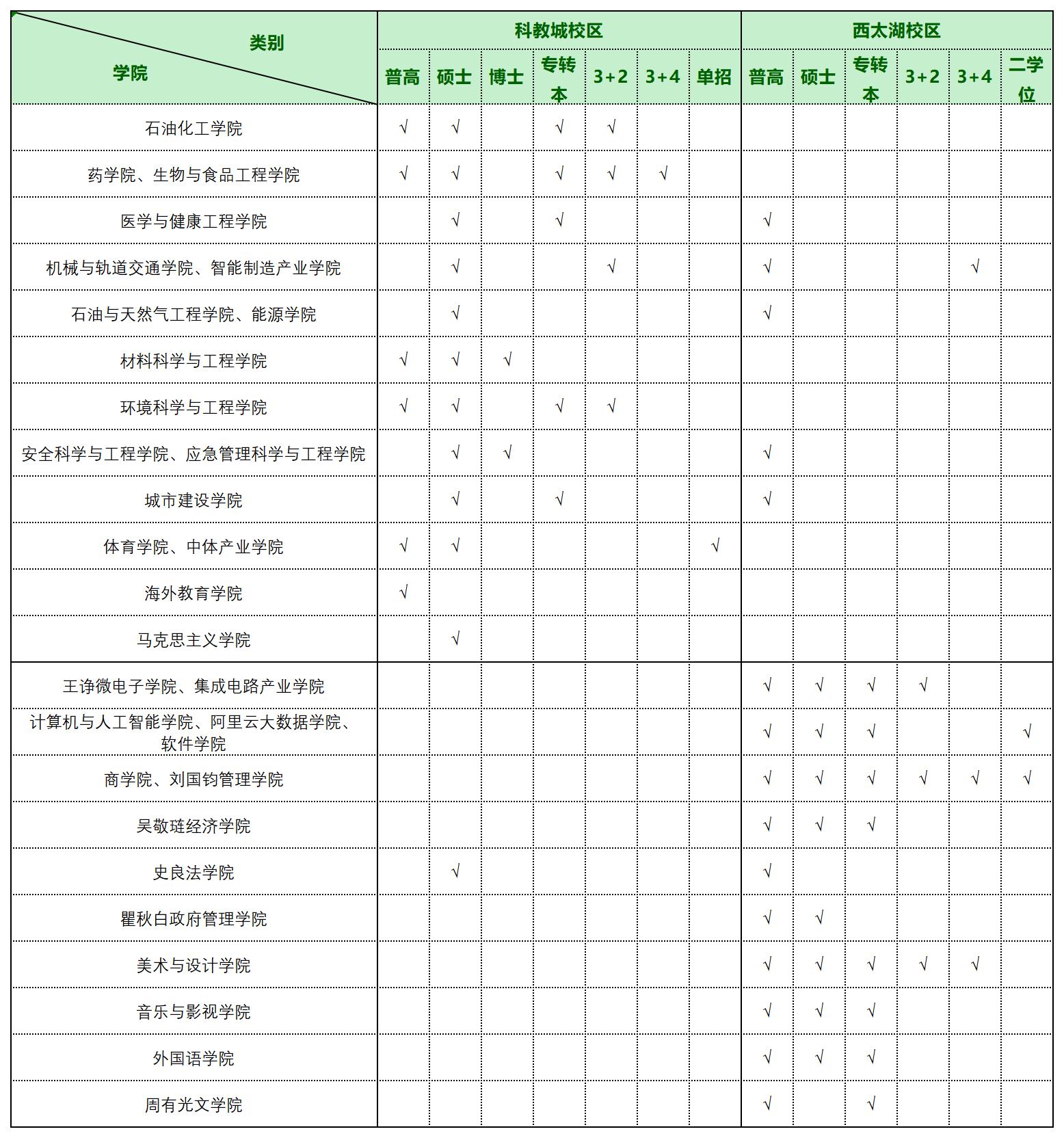 1.科教城校區: ①3+2:應用化學、生物工程、智能制造工程、機械電子工程、環境工程;②3+4:食品質量與安全;③專轉本:應用化學、食品質量與安全、護理學、環境工程、建筑環境與能源應用工程;④對口單招:休閑體育專業。