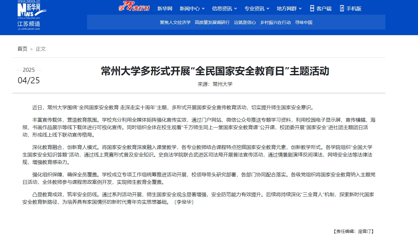 深化教育融合,創新育人模式。將國家安全教育深度融入課堂教學,各專業教師結合課程特點挖掘國家安全教育元素,創新教學形式。各學院組織“全國大學生國家安全知識答題”活動,通過線上競賽形式普及安全知識。史良法學院聯合武進區司法局開展普法宣傳活動,通過情景劇演繹反間諜法、網絡安全法等法律法規,增強教育感染力。