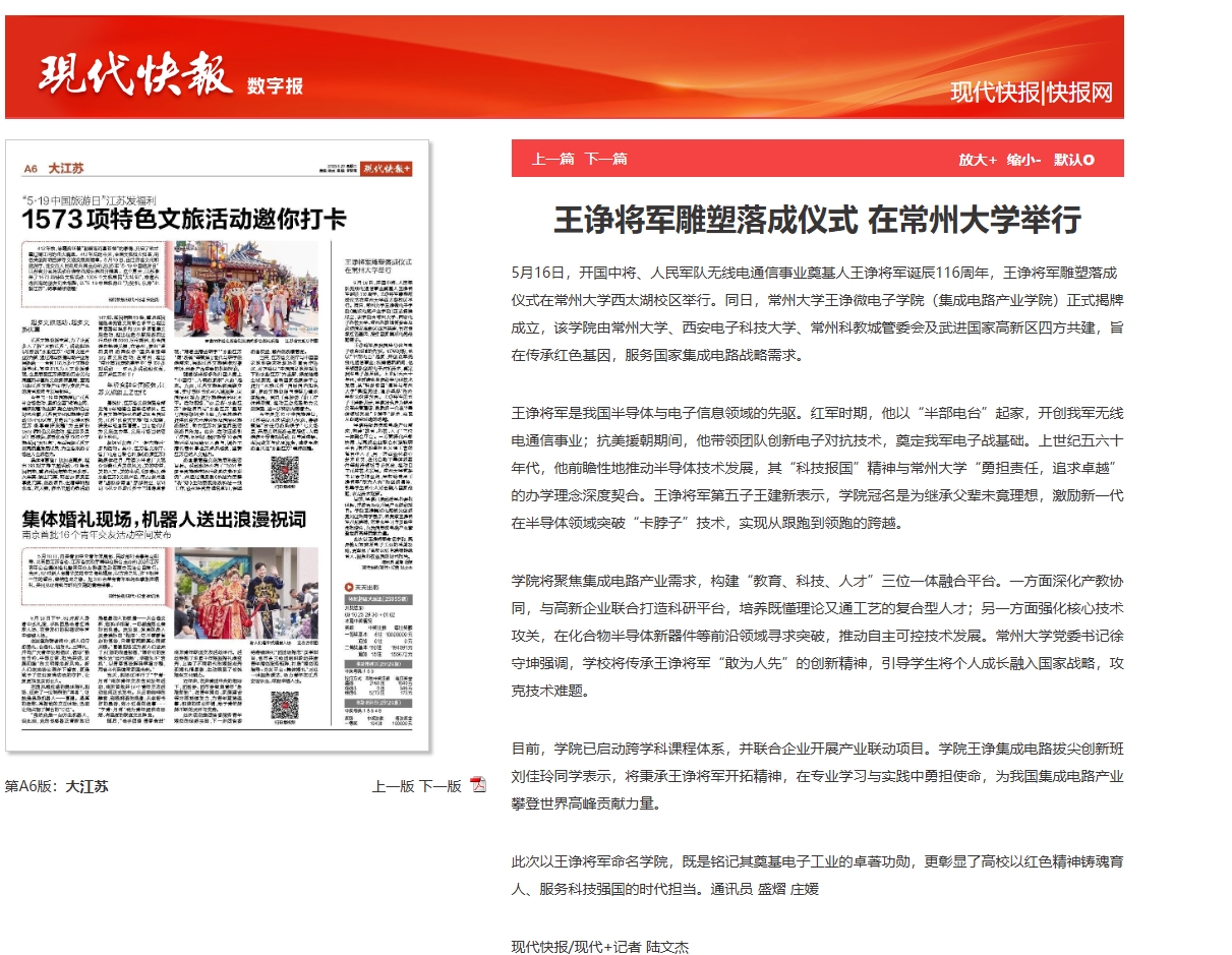 5月16日,開國中將、人民軍隊無線電通信事業(yè)奠基人王諍將軍誕辰116周年,王諍將軍雕塑落成儀式在常州大學西太湖校區(qū)舉行。同日,常州大學王諍微電子學院(集成電路產業(yè)學院)正式揭牌成立,該學院由常州大學、西安電子科技大學、常州科教城管委會及武進國家高新區(qū)四方共建,旨在傳承紅色基因,服務國家集成電路戰(zhàn)略需求。