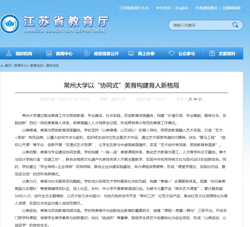 常州大學(xué)通過(guò)推動(dòng)美育工作與思政教育、專業(yè)建設(shè)、社會(huì)實(shí)踐、雙創(chuàng)教育深度融合,構(gòu)建“價(jià)值引領(lǐng)、專業(yè)賦能、服務(wù)社會(huì)、實(shí)踐創(chuàng)新”四位一體的美育育人體系,將美育融入人才培養(yǎng)全過(guò)程,形成具有常大特色的美育工作模式。